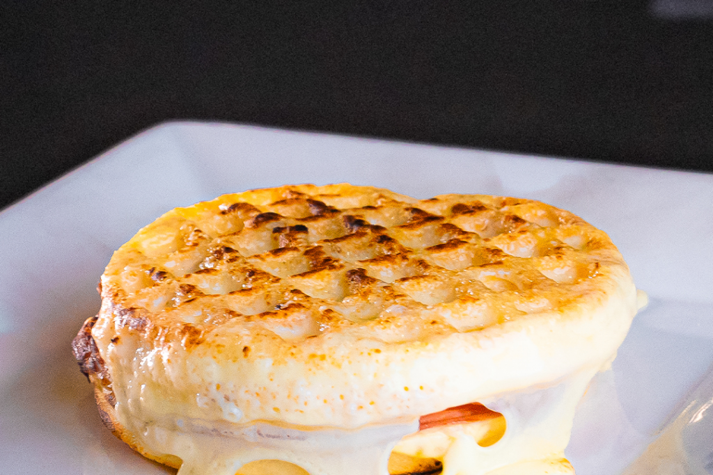• 1 Waffle do Chef: sanduíche de waffle de pão de queijo com requeijão, peito de peru e muçarela ou queijo minas, finalizado com queijo maçaricado