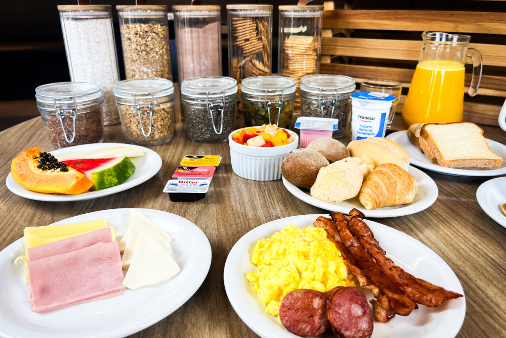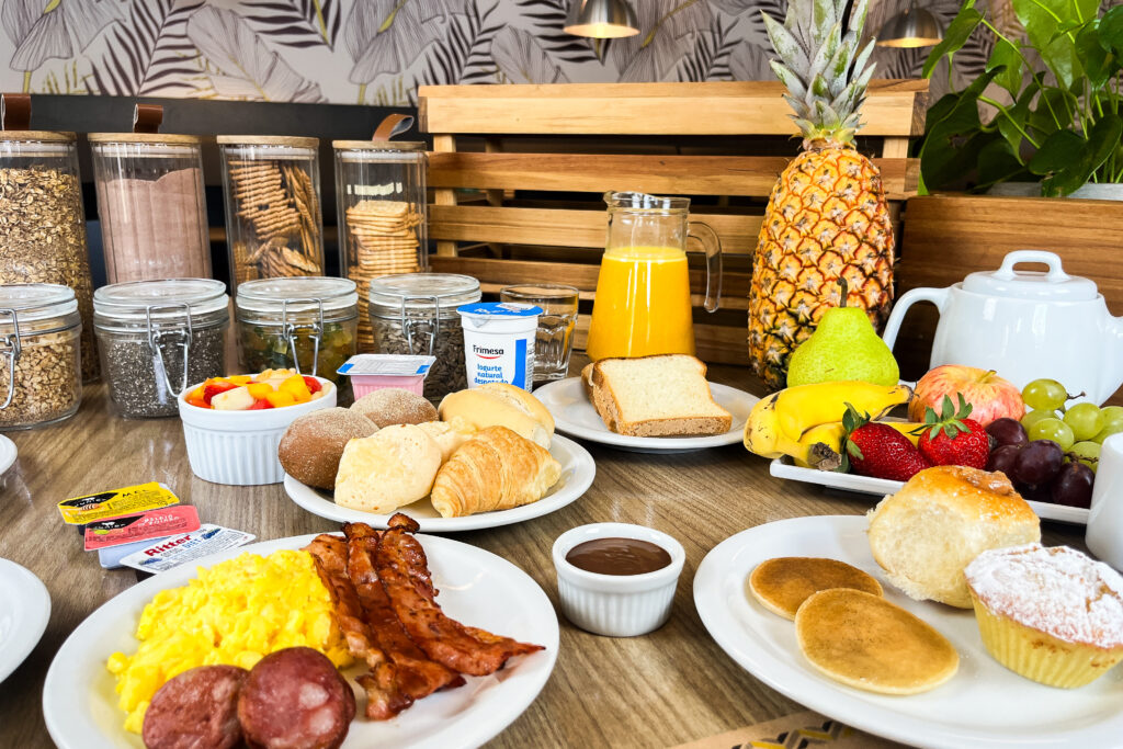 O café da manhã é um dos pontos altos: um buffet completo que combina sabores brasileiros e internacionais, com pães, bolos, frutas frescas, frios, ovos preparados na hora e diversas opções de bebidas quentes e frias. Tudo servido em um ambiente amplo e aconchegante, perfeito tanto para viajantes em trânsito quanto para quem deseja começar o dia com uma refeição especial.