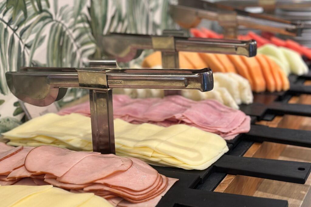 • Pratos quentes: ovo mexido, omelete, linguiça, salsicha, iscas de frango, tapioca, legumes, mandioca e batata doce (variados de acordo com o dia).